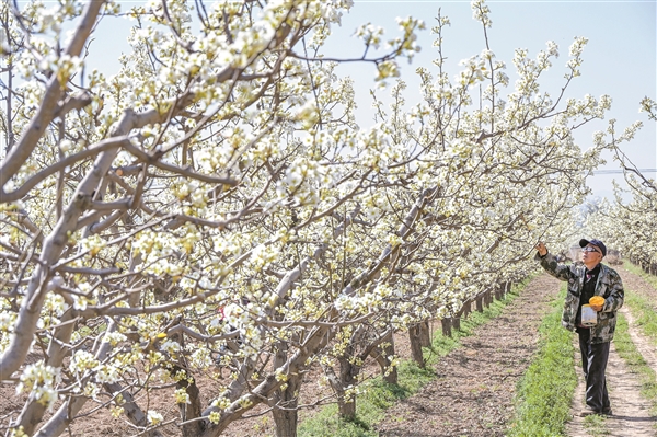 4月9日,平遥县襄垣乡襄垣村村民在梨园为梨花进行人工授粉。清明节期间,襄垣乡6万余亩酥梨进入盛花期,梨农们抢抓农时进行人工授粉,确保酥梨增产增收。