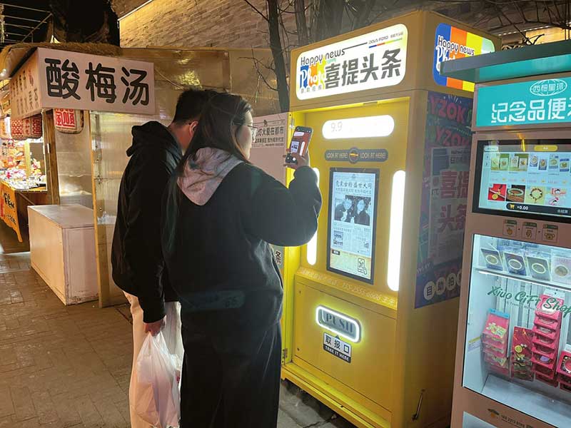 顺着人流拐进古城夜巷欢乐街,烟火气愈发浓郁。“9.9元喜提头条”“登报拍照留念”,创意打卡机上的招牌格外醒目。来自石家庄的情侣赵阳和陈溪正拿着印有自己照片的“特刊”向视频电话中的家人“炫耀”。陈溪笑着说:“9.9元上了头条,照片也好看,是我们在大同的独家回忆。”旁边的摊主则补充道:“现在,人们都喜欢这类个性化体验,把旅行变成看得见的纪念。”