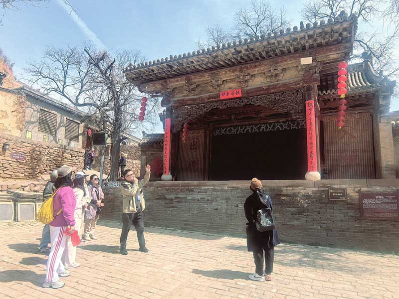 导游王永刚正在给游客介绍后沟古村历史文化。