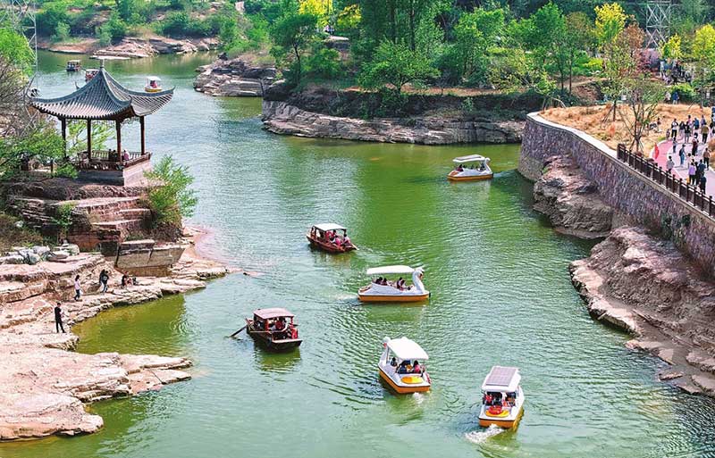 游客在太行锡崖沟旅游度假区体验游船项目。