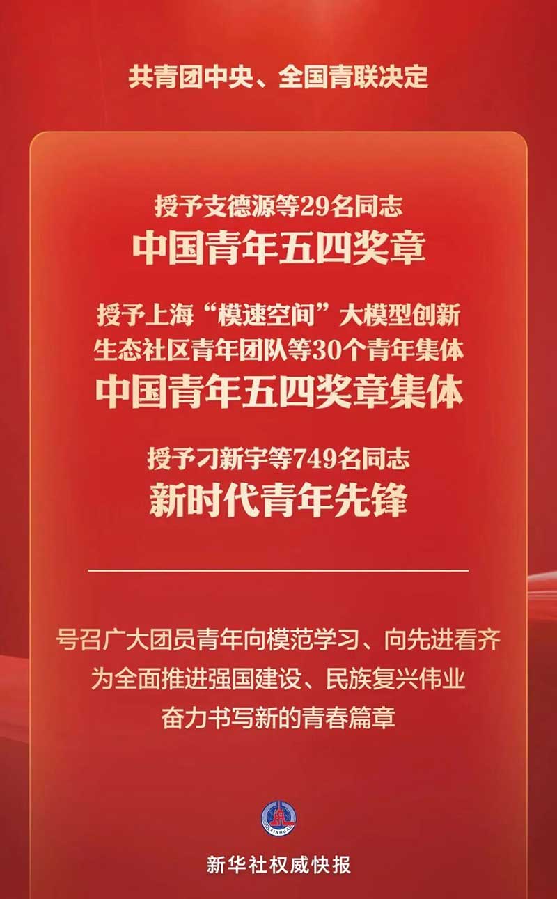 近日,共青团中央、全国青联颁授2026年度中国青年五四奖章暨新时代青年先锋奖,授予支德源等29名同志中国青年五四奖章,授予上海“模速空间”大模型创新生态社区青年团队等30个青年集体中国青年五四奖章集体,授予刁新宇等749名同志新时代青年先锋,号召广大团员青年向模范学习、向先进看齐,为全面推进强国建设、民族复兴伟业奋力书写新的青春篇章。其中,山西1人被授予“中国青年五四奖章”,19人被授予“新时代青年先锋奖”。