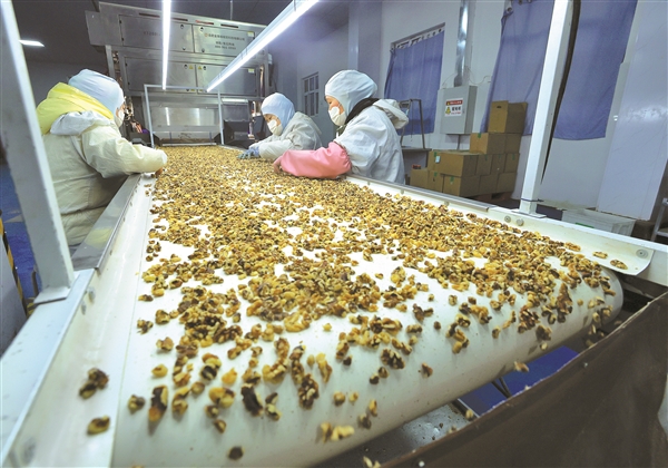 工作人员日前在生产加工车间拣选核桃